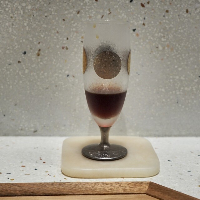 エクアドル産の超希少なアリバカカオを使用したジュレやジェラート、泡、チュイル、コーヒーのグラニテ。