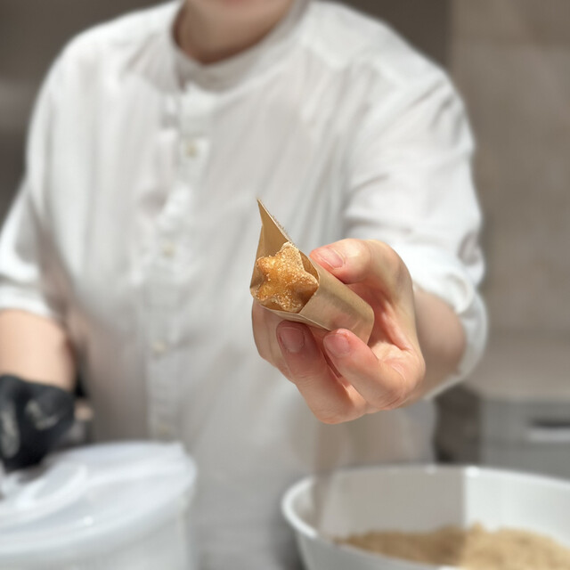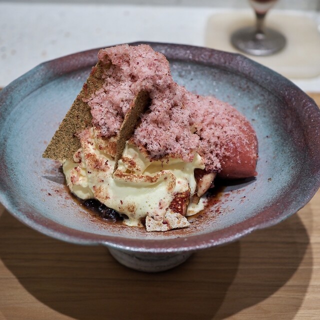 液体窒素で凍らせた栗のムースの下に栗の渋皮煮、熟成していないほぐした栗、最後に蜂蜜をかけていただきました。周りには揚げた栗、カシスソース、キャラメルソース、安保柿、ほうじ茶ジェラートが添えられており、味の変化を楽しめました。