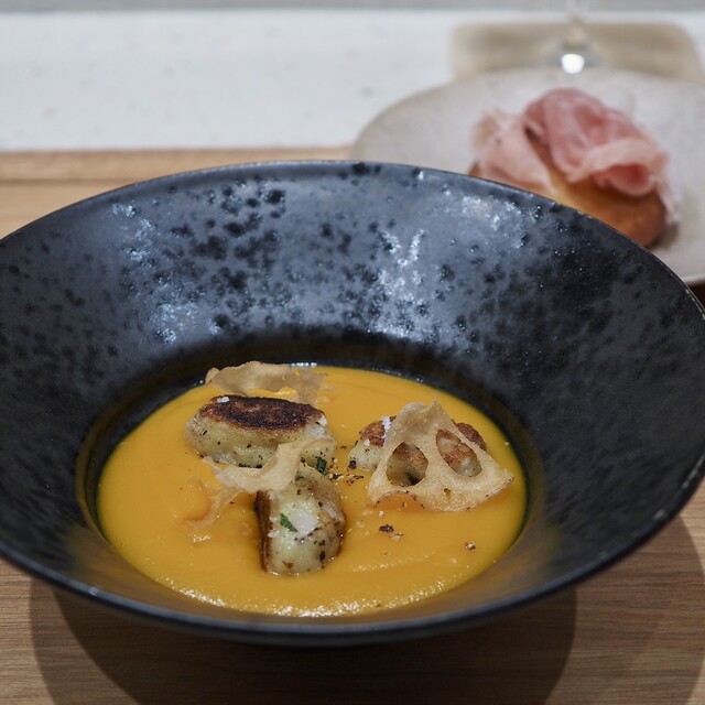 濃厚で自然な甘さのかぼちゃのポタージュに蓮根ニョッキが入っていました。蓮根のシャキシャキ感がとてもよかったです。