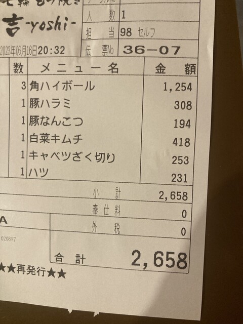 カウンターがあるので空いてるときは一人でもOKな七輪の焼肉屋さん。とにかく安い!焼き物は豚ハラミ308円、豚なんこつ194円、ハツ231円と破格の安さ。野外のテーブルの時はこれが半額になります。ハイボールは一杯418円とこちらもリーズナブル。網は無料で1回のみ替えてくれます。キムチやキャベツも頼んで2.658円ですから最強の安さです。旨いのがまた言うことなし。ヘヴィリピートしてます!席でタバコを吸えるのも有難いです。