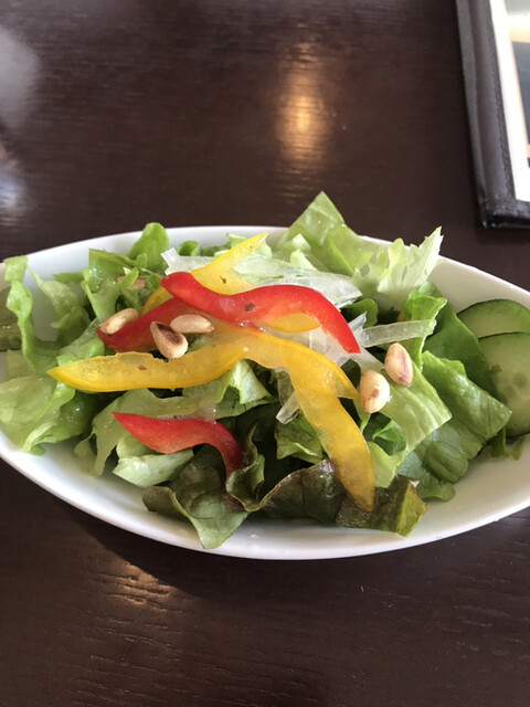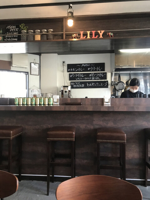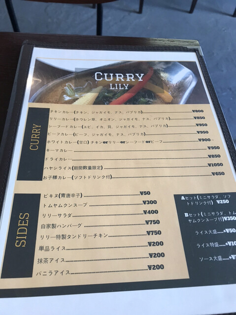 名物のリリーカレーは850円、サラダとコーヒーセットはプラス250円です。リリーカレーはほうれん草、オニオン、じゃがいも、ナス、パプリカと5種の野菜たっぷり。ライスもグリーンカレーに合わせたタイ米で相性は抜群です。マイルド、レギュラーと選べて、