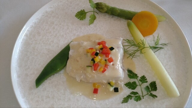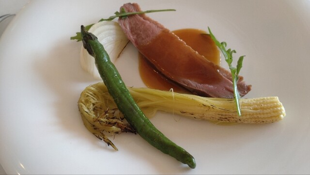 スズキのシャンパン蒸し。鴨肉のソテー オレンジのソース。