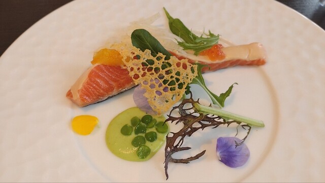 サーモンのショーフロワとイクラうすい豆のピューレ。