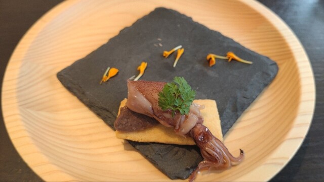 アミューズはクラッカーにホタルイカ。濃厚なお味で美味しかったです。