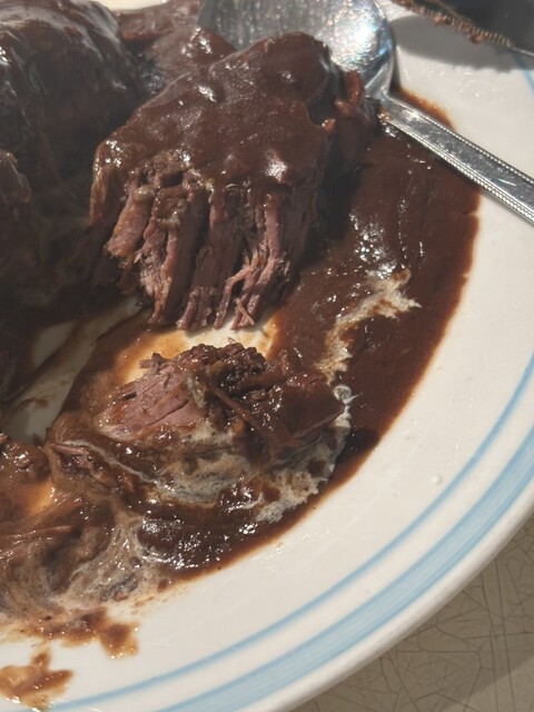 牛肉は箸で切れる程柔らかく、濃厚になるまで煮込まれたシチューとともに口に入れるとホロホロとろけます。名だたる洋食屋さんと互角もしくはそれ以上の味わいです。