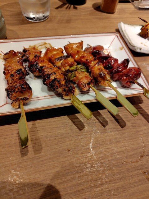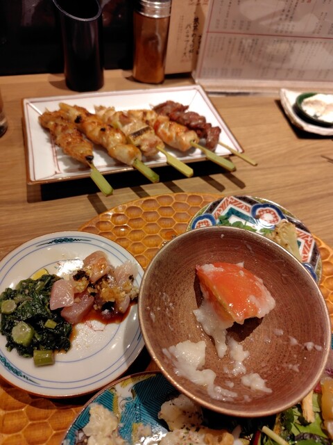 お薦めのおばんざい盛り合わせは5種類あり、どれも美味でした。それから焼き鳥盛り合わせを塩とタレを一セットずつ。塩もタレも美味しかった。鶏が香ばしいのです。焼き方も完璧です。黄身につける鴨つくねも美味しかった。