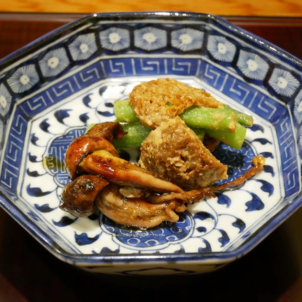 ○うなぎのえり焼き、じゅんさい、トマト、わさびの茎酢漬け