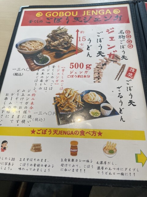 ごぼう天…メニュー記載のとおりジェンガの様に積み上げられたごぼう天…うどんに浸すも良し、添えてあるカレー塩をチョンづけするも良しで、ここに来ると欠かせない一品…とても食べきれる量ではないので、持ち帰りをお願いすれば気持ちよく対応していただけるので心配無用…夜の晩酌のお供になっています◎