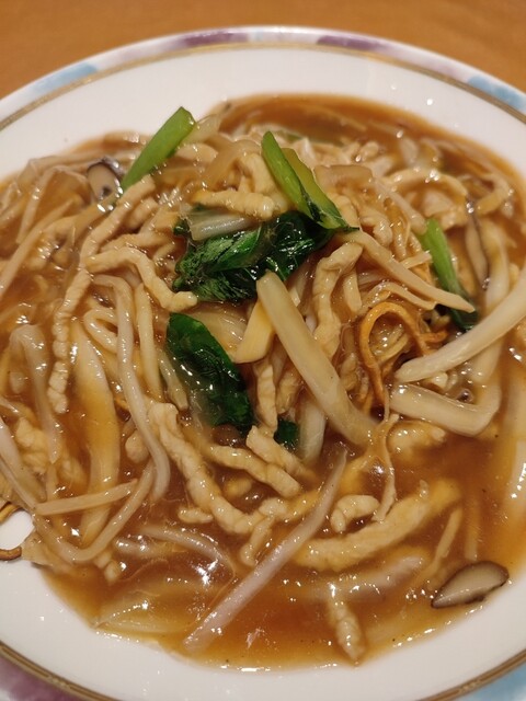 伝統的日本の高級中華料理店で、きめ細やかな下味仕込みから仕事が丁寧と感じます。えび湯麺と肉絲焼そばと最後にランチ杏仁豆腐を注文。えび湯麺は下ごしらえをしたプリップリッ海老で入り、汁も鶏ガラスープをしっかりと取った旨味たっぷりで、これぞ蝦仁湯麺の王道です。次に肉絲焼きそばは細切り豚肉とたけのこと青菜のとろみがかかった焼きそばで、これも最大限旨味を引き出した絶品です。ランチの杏仁豆腐があると聞き、これも注文。杏仁豆腐冷汁という感じで豆腐より汁を味わうという外では味わえない甘さ控えめで上品な杏仁豆腐でした。