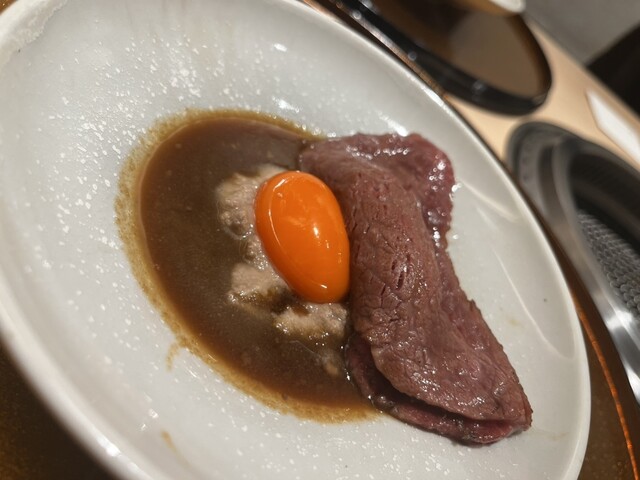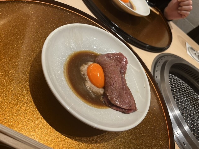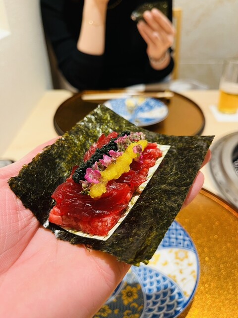 扉を開けた瞬間から特別感が漂う完全個室。新宿の喧騒を忘れさせる空間で始まるのは、スタッフによるフルアテンド焼肉という贅沢な体験。最初に供される和牛と本鮪のユッケドッグは、とろたく仕立てで口当たりが軽く、濃厚なのに嫌味がない。序盤から完成度の高さを感じさせる一品。