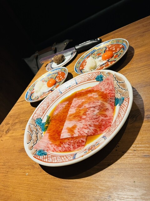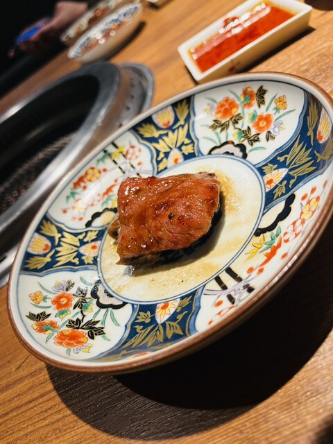 焼きすき鮨は、香ばしさと甘み、酢飯のバランスがよく、焼肉と鮨の境界を心地よく曖昧にしてくれる一品。超脱水タンは、独特の食感と凝縮された旨みが印象的で、泡檸檬が後味を軽やかに整えてくれます。燻製厳選牛は香りの演出が秀逸で、粒マスタードのアクセントが肉の旨みを引き立てます。