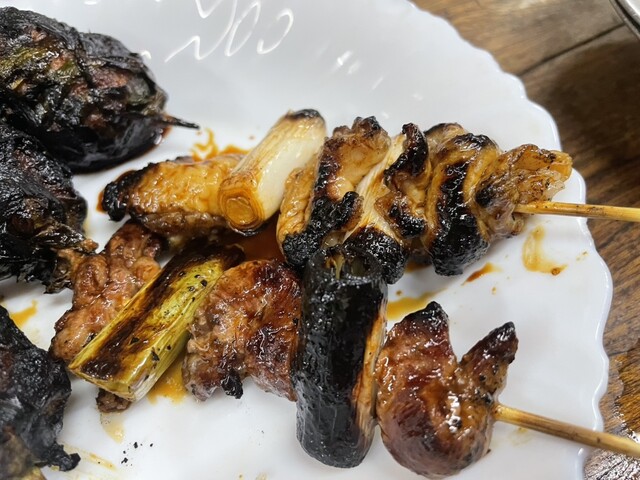 名物まくらは、つくねにニラを巻きつけしっかり焼いたもので、見た目焦げてるとしか思えないのだが、炭化はしておらず、不思議とこれが美味いのよ