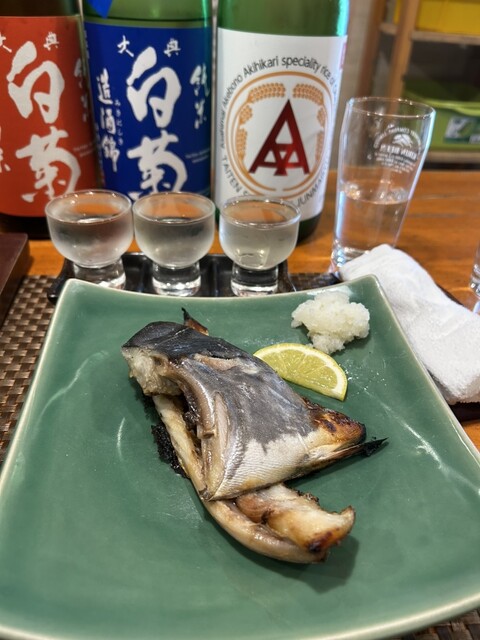 注文したのは、3種の地酒を飲み比べできるセット。つい美味しくて2セット分楽しんでしまいました。おつまみには、岡山名物三種盛り、黄ニラの卵とじ、そしてサワラのカマの西京焼き。どれも丁寧に作られていて、お酒との相性も抜群。特に黄ニラの卵とじは、濃いめの出汁が日本酒にぴったりで、個人的には大ヒットでした。
