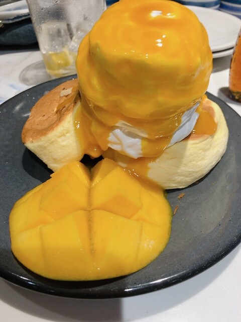 滑らかポテトのチーズがある所も旨いが素材が良いのか芋が旨い(^^)サワーで流しながらすぐに完食 パンケーキは半身のマンゴー、シャーベットがエスプーマの下に隠れてる此方のスタイル