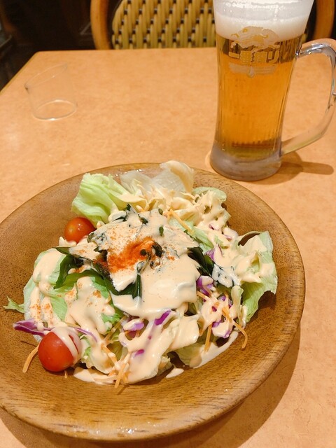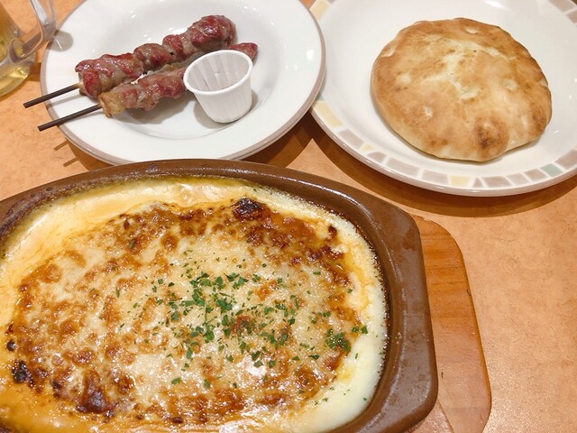 紙に中ジョッキ、ラムの串焼きアロスティチーニ、焼きチーズドリアを頼みました 串焼き旨し!ビールに合う!2杯目を口頭で注文したらば忘れられ慌てて持ってきてくれた生中は三分の一は泡でした...(^^)ドリアもたっぷりチーズでむっちゃ美味しいしデザートもプリン+ティラミスの2種盛りを食べても3000円切る安さ!コスパサイコーでしょ(^^) ご馳走さん♪