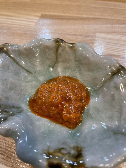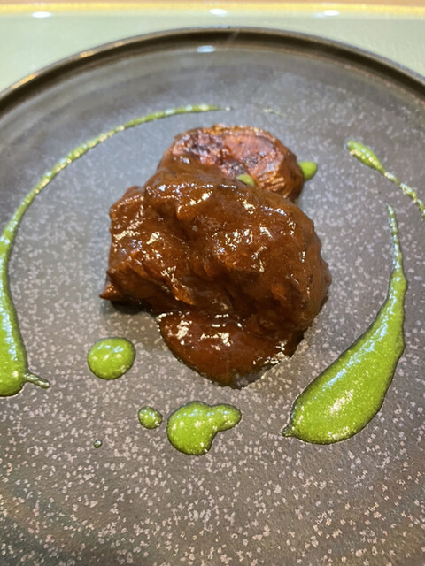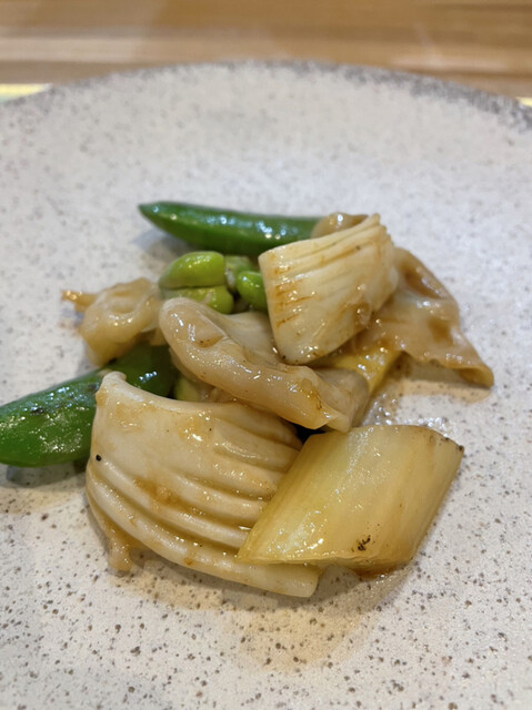 オーナーはまだお若い30代半ば。マンダリンオリエンタルのセンスで修行、その後三田で開業していたお店を畳んで最近八丁堀に開店されたとのこと。もともと寿司屋だった箱で、カウンター席に着くと目の前で調理の一部始終が見られて退屈しない。時々ゴーという音を鳴らす大きなガス火で振る中華鍋では油の下味付けや温度管理など丁寧な仕事が見られて次の菜の期待を高める。点心のニラ饅頭と焼売で味の変化が欲しくなり辛い物を頼んで出てきた自家製豆板醤は最初よく見ず口に入れたらXO醤かと間違えてしまう味の深み。大体広東現地の高級店では自家製XO醬や豆板醤を瓶で売ってるので思わず「これ売ってないの?」と聞いたほど(残念ながら売ってないそう)。