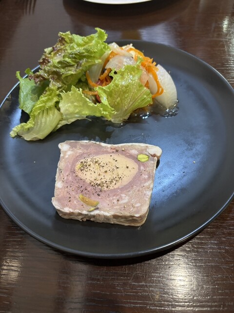 前菜は海の幸のクープ仕立てと田舎風お肉のパテ、