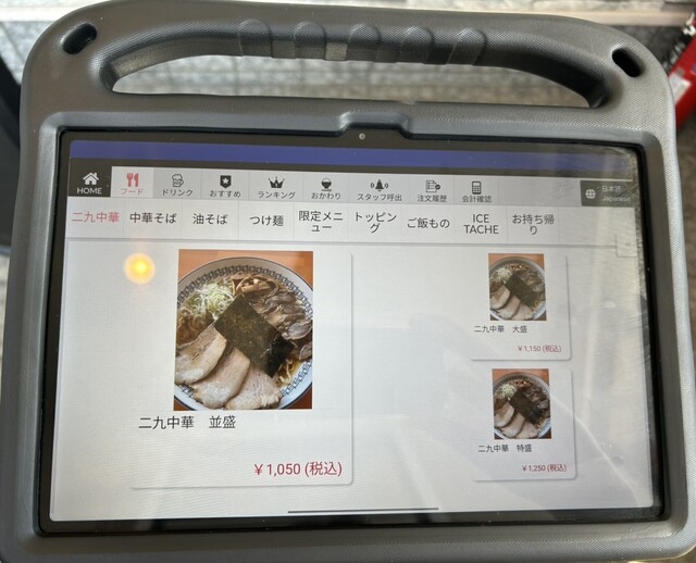 タブレット注文の際、麺の硬さ、量、スープの濃さ、油(鶏油)の量等が選択可能。今回は初訪なので全て普通を選択。