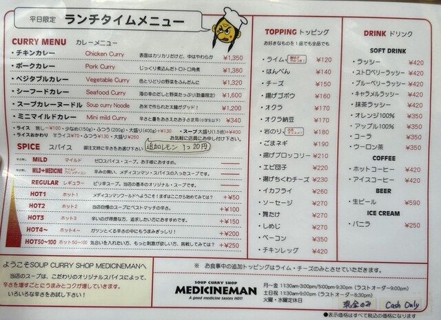 北海道に来たらスープカレー!って事でこの日は同僚の推めでこちらに訪問。その名も「メディスンマン」どうやら治療や癒しを意味する店名らしいですが、実はローカルヒーローだったり?よく分かりません笑。もちろん初訪です
