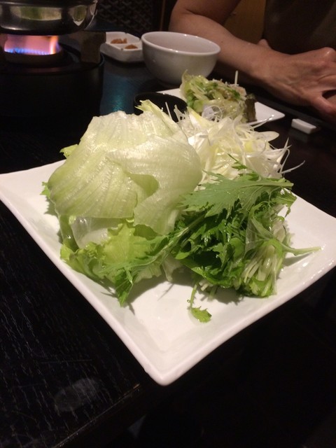 レタス、ネギに水菜と、バラ肉をしゃぶしゃぶとして、一緒にたれに漬けて食べる。