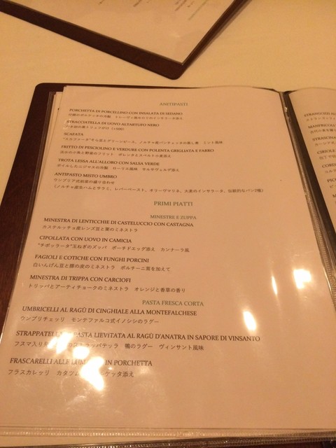 先ず、イタリア料理も詳しく無いのに、ウンブリア州の料理 なんて到底わからない。楽しくメニューを眺めても、想像できないものも多い。