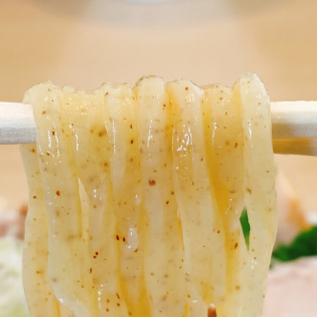 “さすが豚骨の銘店”な感じが溢れ出ているつけ汁は、濃厚クリーミーながらも魚介がシッカリ主張していてキレ味がとてもよく、トッピングの“旨辛ニラコショウ”を味変に投入しながら夢中で頂きました♪(´ε` )