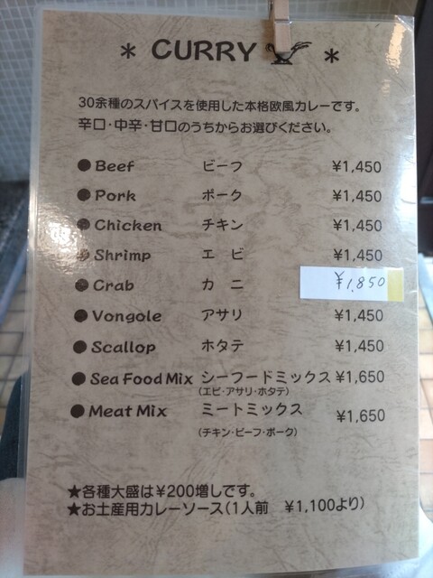 メニュー表。カレーとしてはややお値段が張るように見えますが、食べてみると納得感が伝わってきます。是非一度ご賞味あれ!
