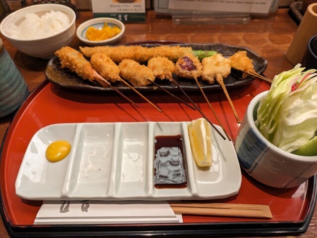 私の注文は串揚げランチ。串8種で、エビ、イカ、豚、牛、ナス、アスパラ、さつま揚げ、カボチャ。単品メニューから、旬の秋刀魚と新栗を追加。