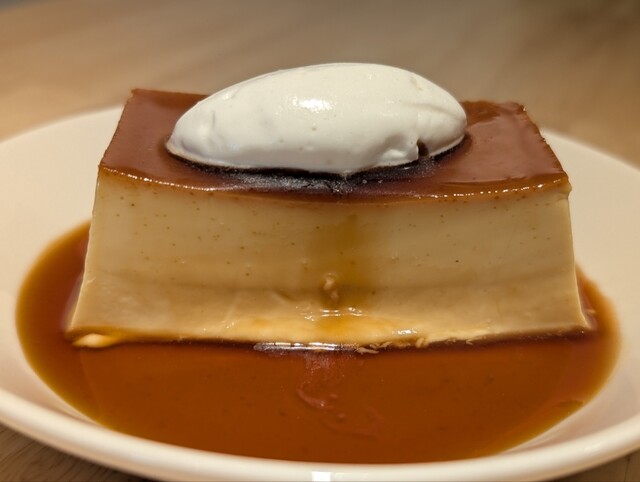 まっ白な円形のお皿に盛り付けられた直方体のプリン!!