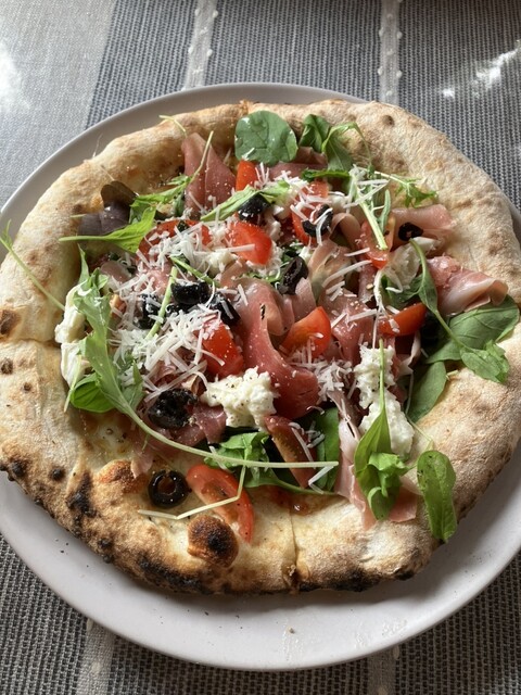 たっぷりの生ハム、フレッシュのモッツァレラチーズ、フレッシュルッコラ、フレッシュトマト、ブラックオリーブなど、具材が多すぎてカットも4等分でした^ ^