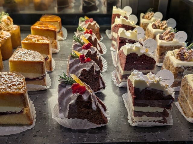 ショーケースには他にも、雪だるまやリースやツリーを模したケーキが並び、見ているだけでワクワクする空間✨。 また、hannocならではの「作り手の顔が見える」焼き菓子も魅力的です。シェフの写真付きで紹介されているフィナンシェや、クリスマス限定のクグロフアソートなど、手土産にしたいお菓子が目白押しでした。