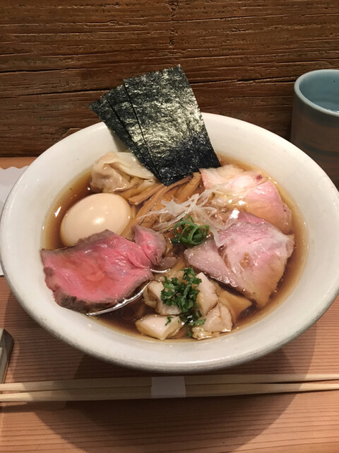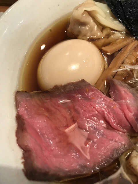 麺はツルツルで啜り心地が良い平打ち麺で、スープと良く絡みます。トッピングは黒毛和牛のローストビーフや鰹節などラーメンの枠を超えていると感じました。