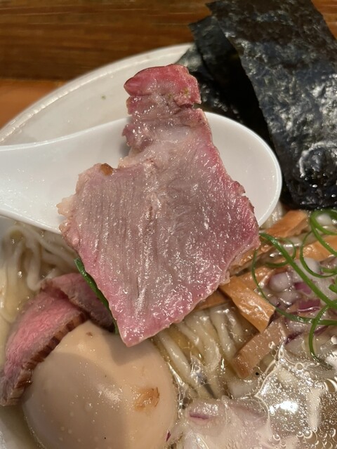 着丼した塩らあめんは、澄んだ美しいスープに綺麗に整えられた麺線と赤いローストビーフが印象的で、味玉、海苔、チャーシュー、めんま、葱、鰹節がトッピングされてます。ラーメンの枠を超えたビジュアルだと思います。