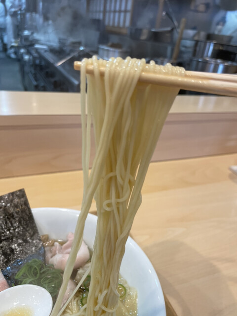 柔らかめに茹でられた中細ストレート麺は、とても長くて口いっぱいに啜って麺を味わえます。スープと一体化してこれまた素晴らしいです。