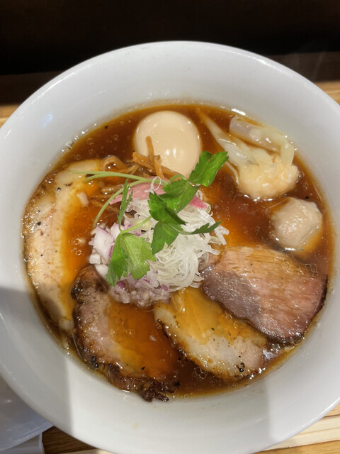 濃い色の醤油スープに4枚の焼豚と肉雲呑と海老雲呑と味玉が整然と並べられて真ん中に紫玉ねぎとねぎと三つ葉がトッピングされてます。