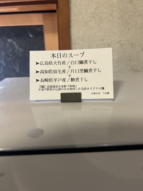 調べてみると、醤油も塩も滅茶苦茶旨そうで、悩みに悩み"特中華 貝 だし淡麗 塩"にしました。席にはスープと麺の拘りも紹介されたメモも置かれています。