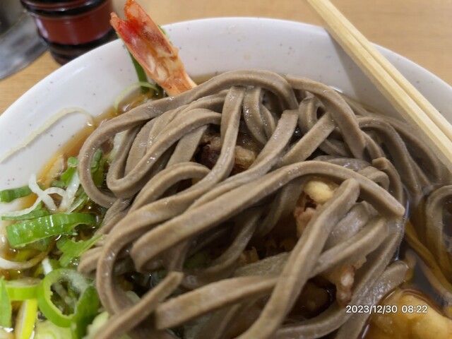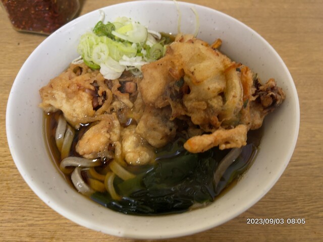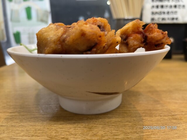 あったかい太蕎麦小盛りにジャンボゲソの黄金パターンでお願いする。