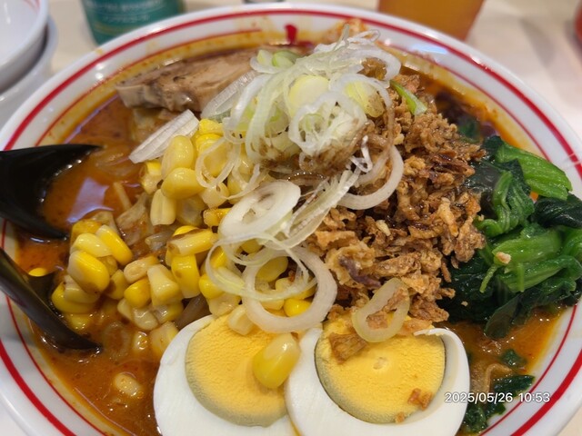 通算73杯目のゴモミ※画像は野菜大盛、コーン、マー油、ほうれん草のせ
