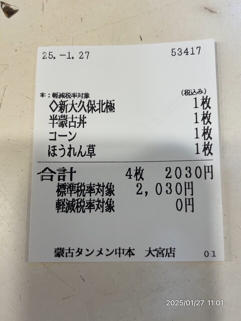 限定の新大久保北極をメインに、コーン、ほうれん草を連打。やはり生まれ育った大宮店で800Pに到達したいという思いから半蒙古丼も押す周年仕様です。