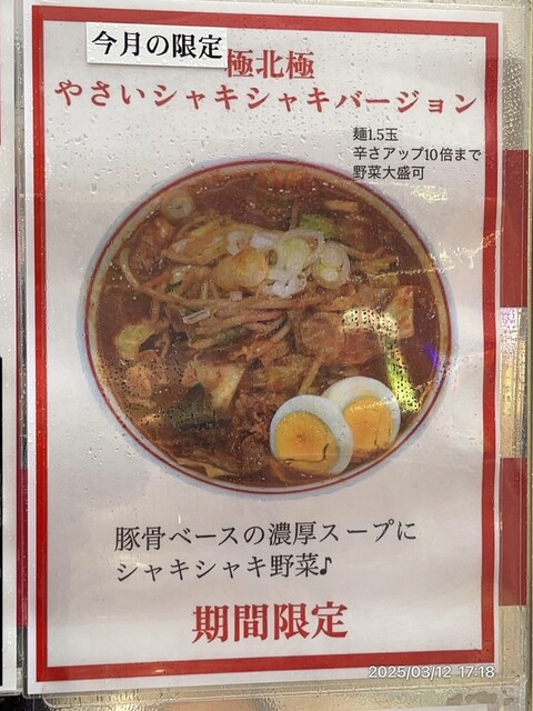 辛さアップは10倍まで、野菜大盛不可、麺は北極扱いで並盛1.5玉の特大(2.5玉)まで。