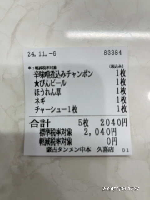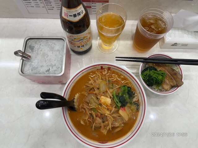ちゃんぽん、ビール、チャーシュー、ほうれん草、ネギで2,040円