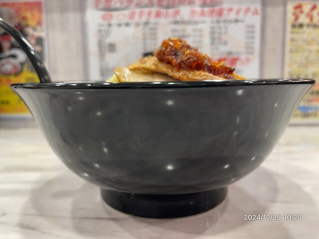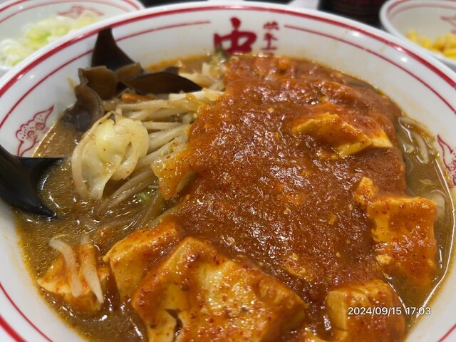 醤油ベースのスープに特製の黒麻婆がかかっており、その名の通り中本伝統メニュー「樺太ラーメン」のスタイルを踏襲してます。スープはシイタケと背脂が加えられて濃厚で味わい深く、黒麻婆はひき肉と花椒を使っていますが唐辛子はほとんど使用されておらず、「黒」は使用している中華の醤(ジャン)の色でありマー油やイカスミなどを使用しているのではありません。辛さも豆板醤から作られており実物の麻婆は赤黒い色をしています。