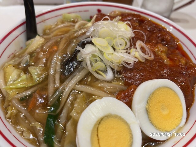 非辛の醤油ラーメンに冷味丼の餡がかけられており、往年の樺太ラーメンを彷彿とさせます。冷味餡の辛さは最高ですが、醤油スープと混ざる事で辛さが抑えられるので辛さは8とします。。混ぜると醤油の味が跡形も無く消えてしまうので少しずつ混ぜて食べるのが吉。