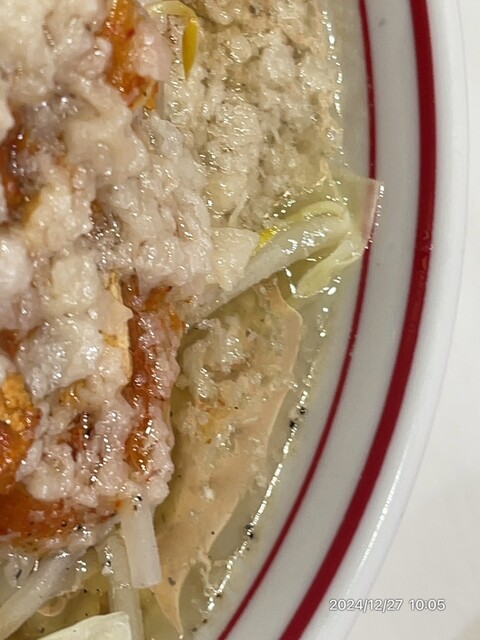 スープあつあつ。なるほど。これがニンニク油か。丼の縁を見るとその膜が確認できます。