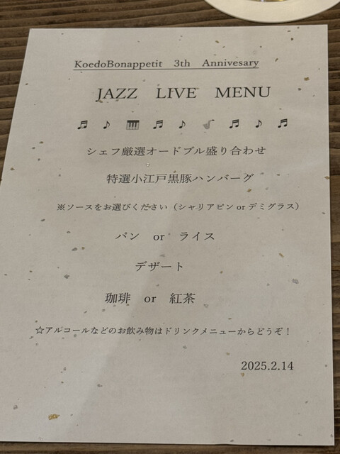 『小江戸 ボナペティ』さん、1周年記念で営業を休止しているディナータイムにJAZZ LIVEを開催されることを聞き、予約しておりました^_^