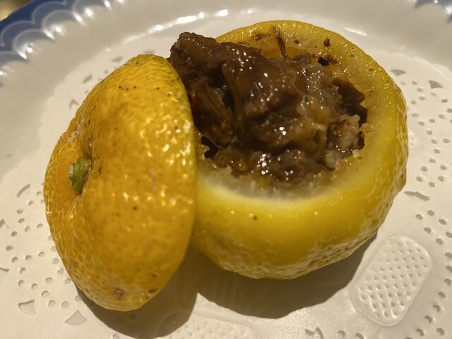 追い討ちを掛けるように、柚子に収められた「牛テール煮込み」、ピリ辛に柚子の風味がたまりません♪