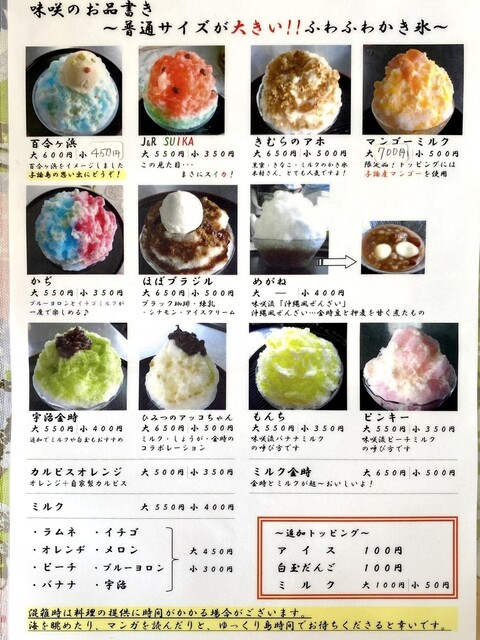 赤崎海岸駐車場の前にある食堂で、かき氷で人気があり、11時のオープン後はすぐに一杯になります。店内は昭和の海の家を思い出す懐かしい佇まい。天井には落書きがびっしり書かれており、愛されるお店なのですね。