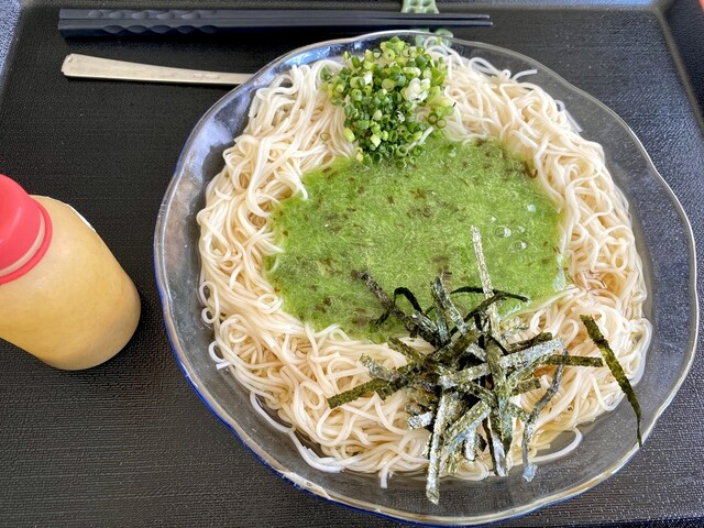 もずく蕎麦(磯香そば:800円)は、もずくをおりこんだ麺がツルツルして弾力がある感じ。もずく自体もクセがなくとても美味しい。翌日食べたもずく雑炊(780円)は、酸味があって美味しかったです。カミさんが食べたもずくオクラそうめん(750円)は、あっさりした味わいでした。途中で味変させる調味料も出してくれました。