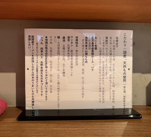 卓上にはラーメンの説明、扇子、割り箸が置いてあります。