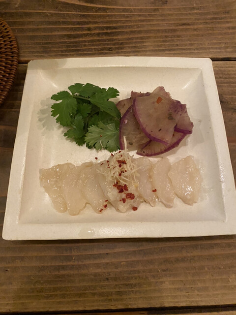 本日の一品のゲソ和え、魚のサラダ、発酵豚肉、黒米などをいただきました。
